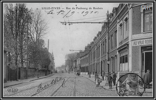 Faubourg-de-Roubaix est pris en direction de Lille intra-muros, au carrefour de la rue de la Briqueterie dont l'angle est représenté par le café "Au Vrai Roubaisien". L'opérateur est positionné à hauteur du dépôt de la Compagnie des Tramways Electriques, aujourd'hui disparu.