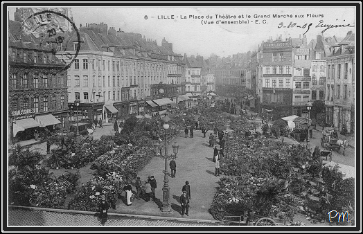 LILLE - La place du Théâtre et le grand marché aux Fleurs (vue d'ensemble)