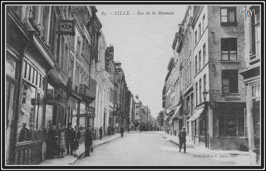 Cette autre vue de la rue de la Monnaie est prise quelques années après ce cliché-ci, toujours à hauteur de la rue Comtesse en direction de la place du Concert. Le même tabac fait la promotion de son commerce.